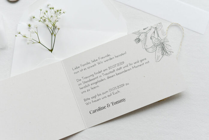 Die Einladung ist die Visitenkarte für die Hochzeit. Daher kann man sie nicht beim Einkaufsbummel von der Stange besorgen. Einfallsreichtum, Geschmack und Individualität sind gefragt. Die Hochzeitseinladung schreiben sehr ambitionierte Paare sogar selbst, aber ganz in Eigenfertigung muss das Projekt nicht angegangen werden. Glücklicherweise gibt es professionelle Anbieter, die dem Hochzeitspaar bei der Erstellung und Vervielfältigung unter die Arme greifen können.