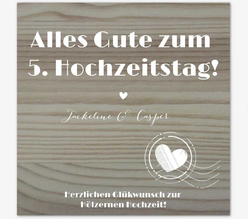 - „Möge eure Ehe weiter so stabil, warm und lebendig bleiben wie gutes Holz. Alles Liebe zum 5. Hochzeitstag!“